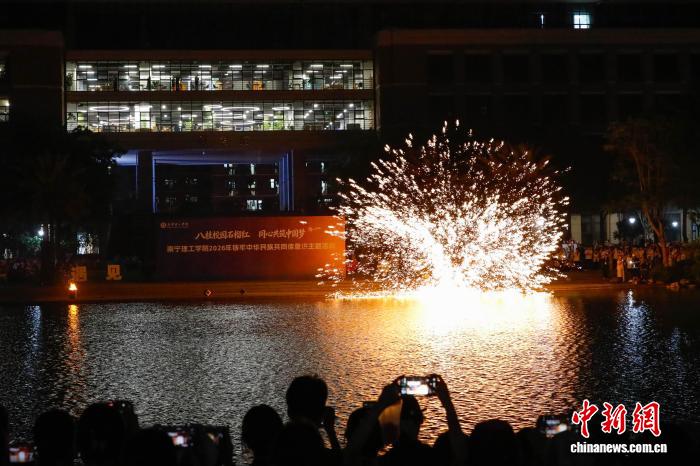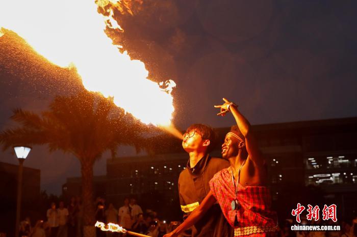 图为肯僧亚青年参与喷水演出。杨宗衰 摄